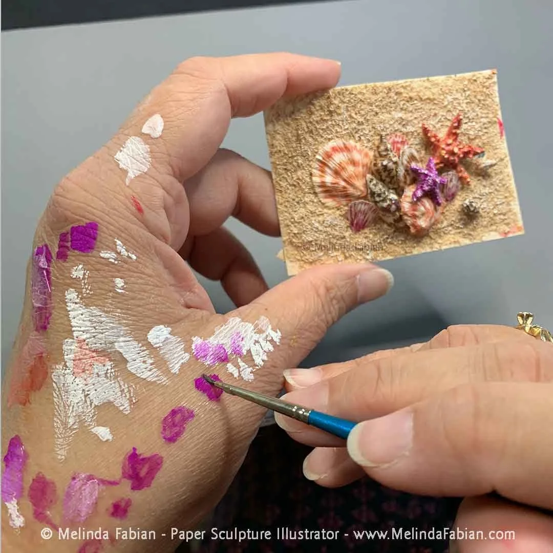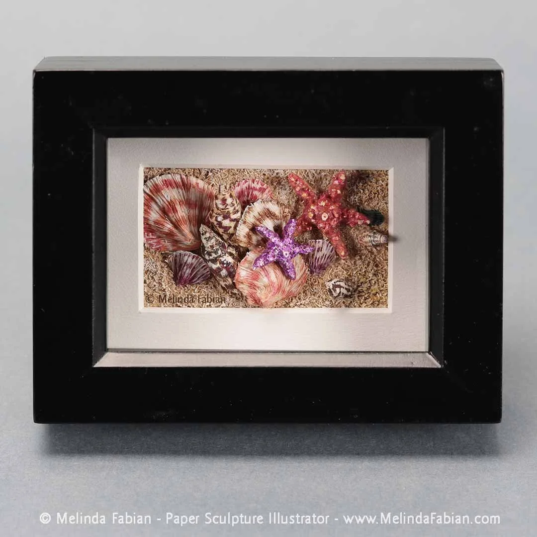 This miniature paper sculpture illustration is three-dimensional. The shells come up and out of the piece of paper and are quite small. Even the sand on the beach is made of paper that was cut by hand and then painted in watercolor and gouache. The outside frame measures just 3.5 inches by 4.5 inches.
