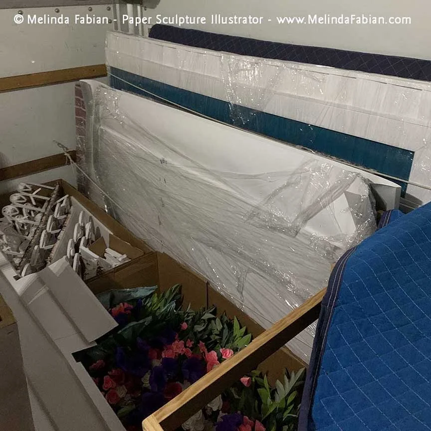 Today’s story begins near the end of my process. The work in my studio is completed, and my installation is about to leave my studio and make its way to the Mansion at Strathmore. Because it is such a large installation, I purposely designed the entire piece in small pieces and manageable sections that will all come together into one large scene. Some of the sections though are still too large to transport in my car, so I had to rent a truck. The largest sections of the piece are 7 feet high by 4 feet wide, though are all lightweight. It may be easier to transport, but there are a whole lot of pieces.