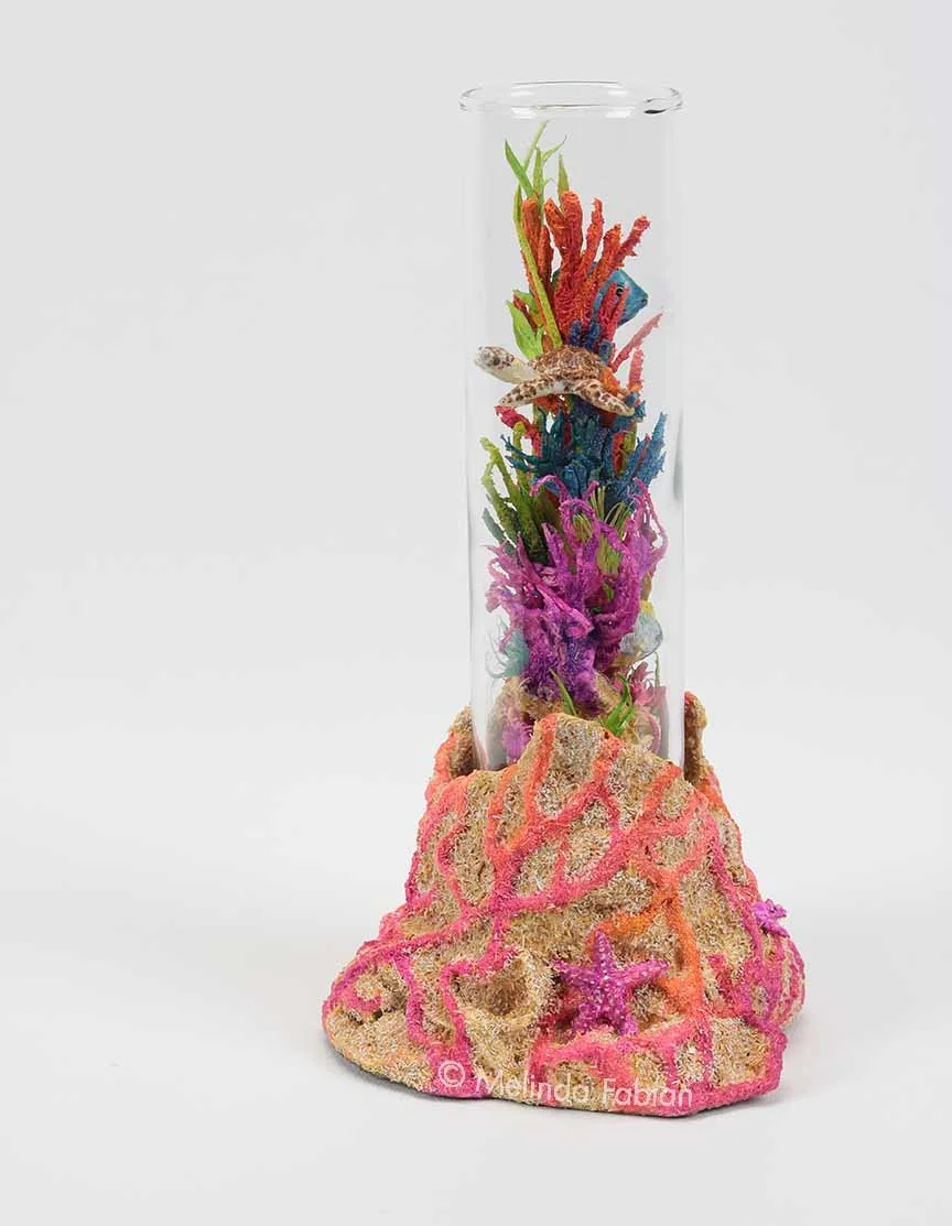 This paper sculpture captures several fish enjoying a swim in the colorful sea grasses in a lighted tube perched on a sand-like base made entirely from paper.