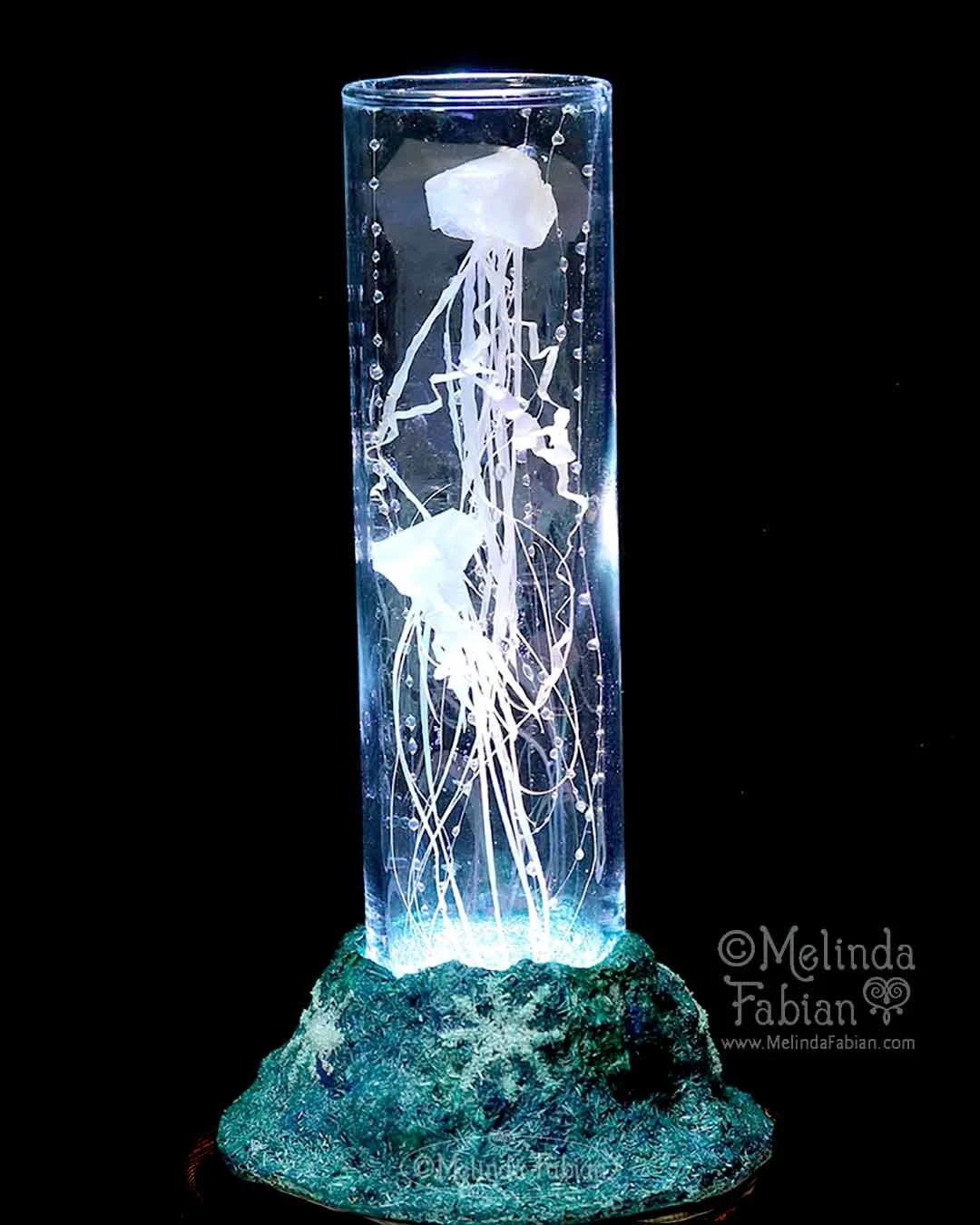 This paper sculpture features two jellyfish floating free in a lighted glass tubular vase giving the appearance of an aquarium. The glass aquarium sets on a sand-like base painted in bluish-teal colors and is made entirely from paper and paint. The paper sculpture can set on top of a rotating base that lights up to display various colors. This feature really adds a life-like quality to the jellyfish making it appear as though they are really swimming inside the glass aquarium.