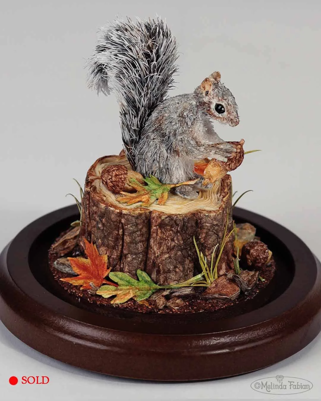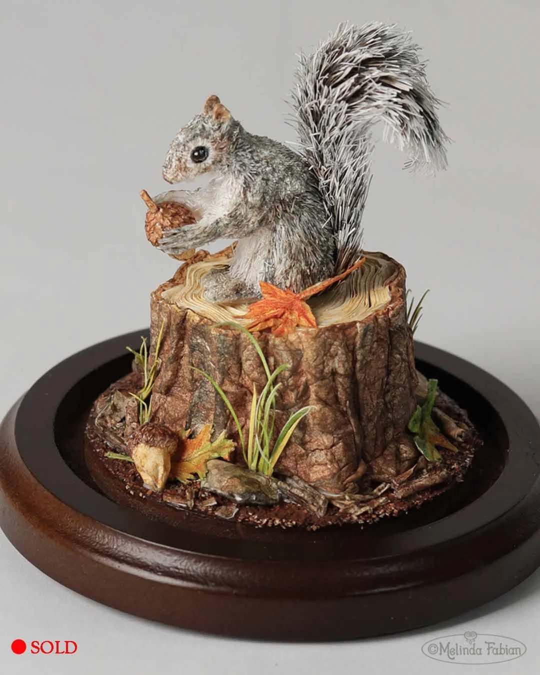 A 3D paper sculpture of a squirrel holding an acorn and sitting on a tree stump. There are colored leaves and acorns laying on the ground around the tree stump. It is madae entirely out of paper and watercolor and gouache.