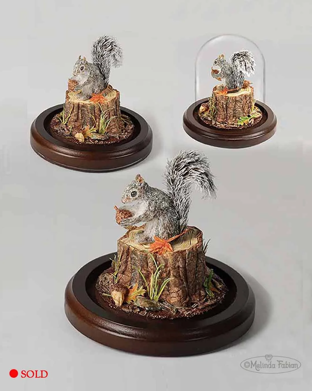“On My Soapbox” is a three-dimensional paper sculpture of a squirrel holding an acorn. He is sitting on a tree stump that is surrounded by colorful autumn leaves and grasses. The sculpture is made from hand-cut paper and watercolor and gouache paints.